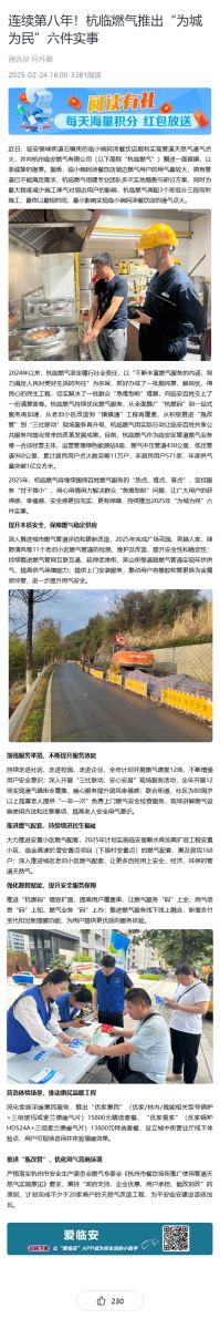 2025年,杭臨燃氣將繼續(xù)圍繞百姓燃氣服務(wù)的“熱點、難點、盲點”,堅持服務(wù)“甘于微小”,用心用情用力解決群眾“急難愁盼”問題,讓廣大用戶的獲得感、幸福感、安全感更加充實、更有保障,持續(xù)推出2025年“為城為民”六件實事。